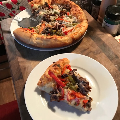 Who doesn’t love a Philly Cheesesteak? I think it’s a safe bet the answer is they love this traditional sandwich. Today I thought I’d do a “mash-up”. I’m combining all the ingredients for a Philly Cheesesteak and putting them on a pizza. I’m making two pizzas cause one just won’t be enough. Better yet, I’m making them in my cast-iron skillet. The cast-iron skillet, because of its size, gives you a nice, thick crust. This replicates the traditional hoagie roll of a Philly Cheesesteak sandwich.