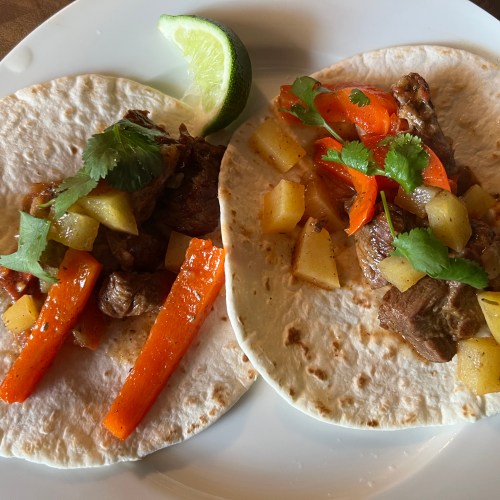 Spoon a little of the stew, making sure to get a little of everything into the center of the warm tortilla. Spritz with some lime, and add a few cilantro leaves over the top.