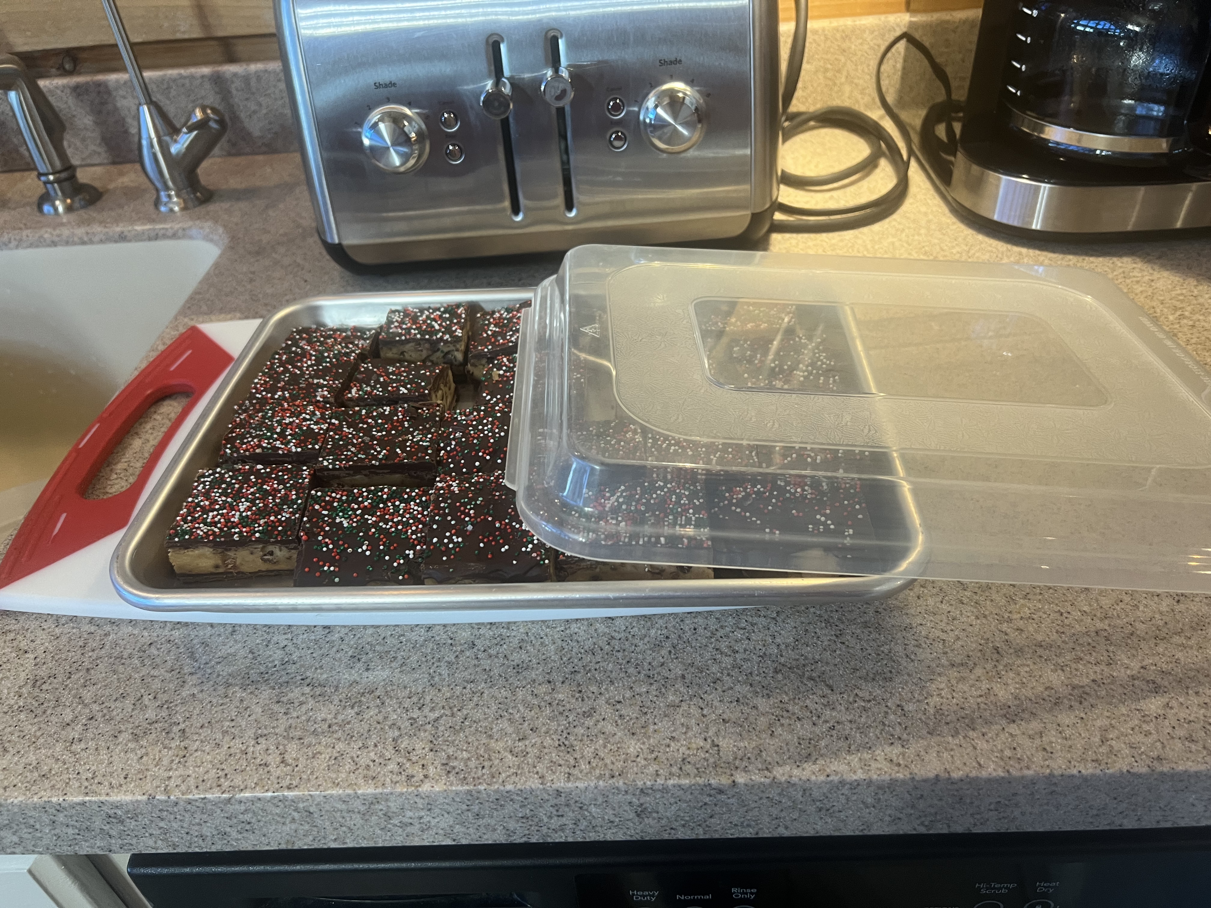 This month’s meeting is our quarterly meeting combined with a Christmas party for the neighborhood. This is the first one for Steve and me. This meeting is a potluck, and I’m bringing my Chocolate Chip Cookie Dough Bars for dessert. A No-Bake Indulgence! These bars will cure any sweet tooth you may have. I used Christmas-colored sprinkles, but you could use any color you choose to decorate these bars.