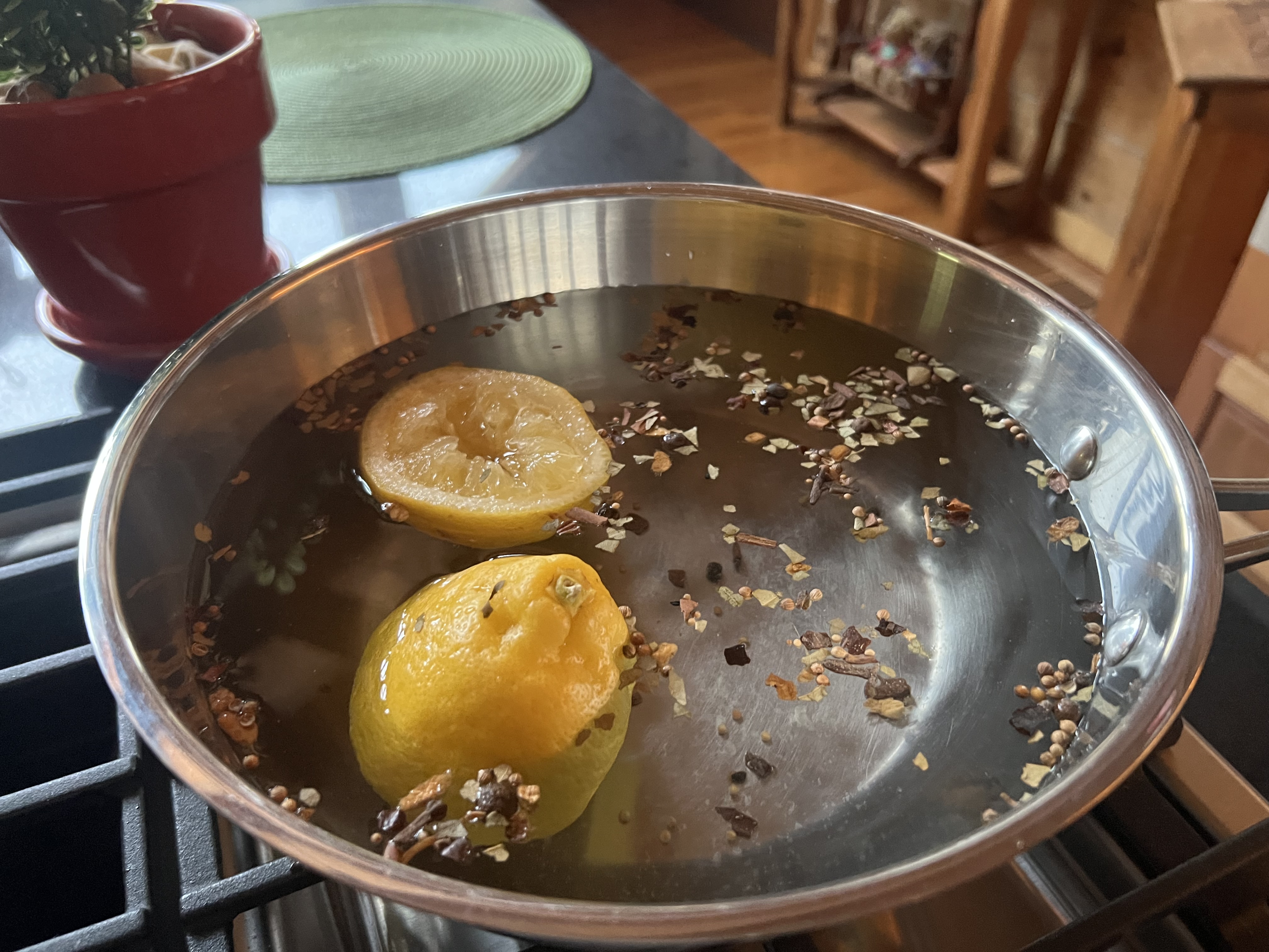 In the meantime, fill a saucepot just over half full with water. Cut a lemon in half, squeeze the juice and the lemon halves into the pot. Add the pickling spice. Turn the heat on medium-low and bring the liquid to a boil slowly, allowing the flavors to incorporate and season the water.