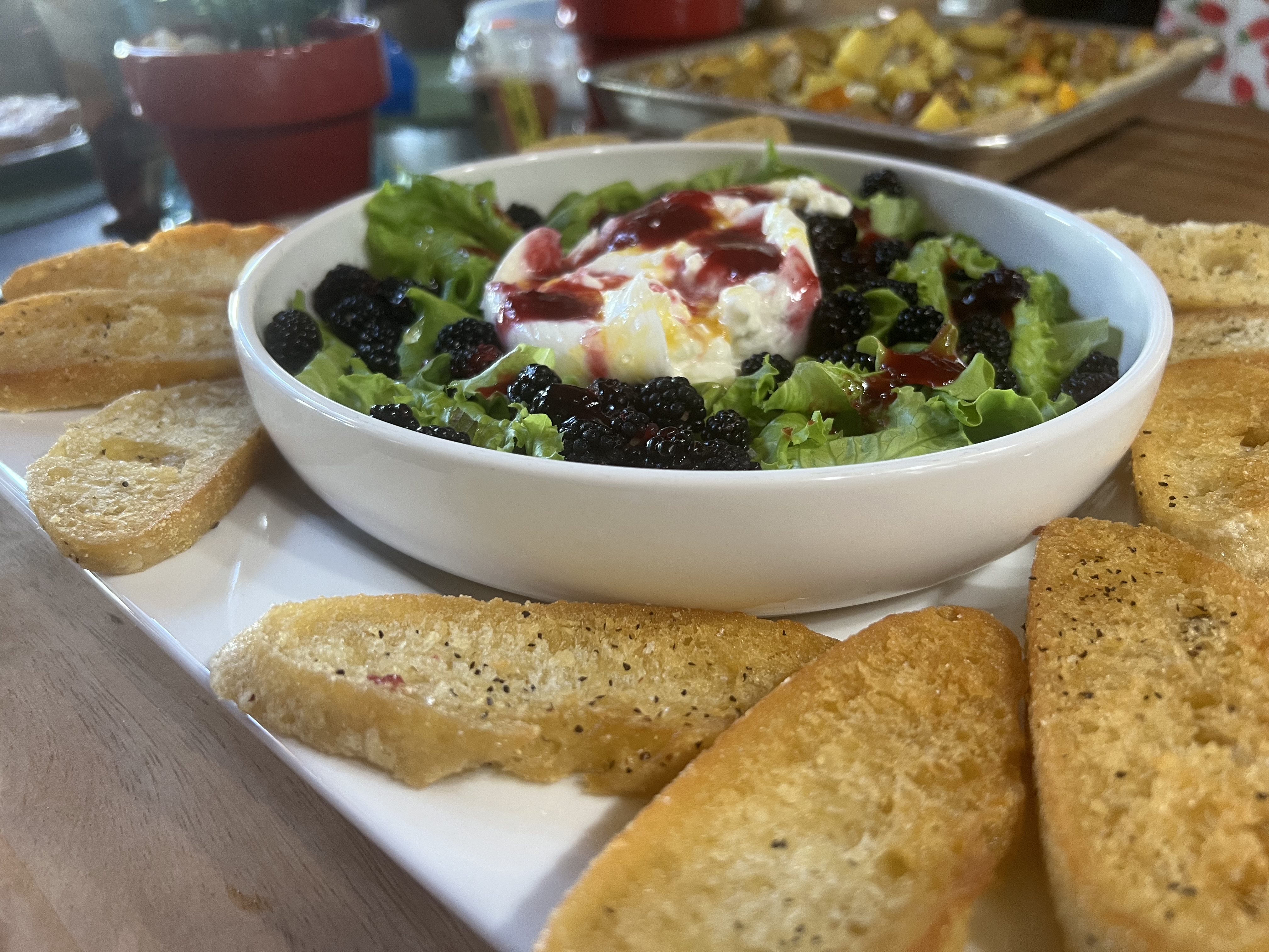 My Burrata With Passion Fruit And Wild Blackberries is a beautiful sight. This dish is an awesome appetizer to serve your family and friends. My husband is always collecting the blackberries from our backyard, and I’m always trying to think of ways to use them. I made this using the extra blackberry syrup from my Wild Blackberry Galette, the extra butter lettuce from my Shrimp Salad, and frozen passion fruit I found at the grocery store. Finishing the dish up with a drizzle of our local honey and baby basil leaves, I couldn’t be happier with how it turned out.